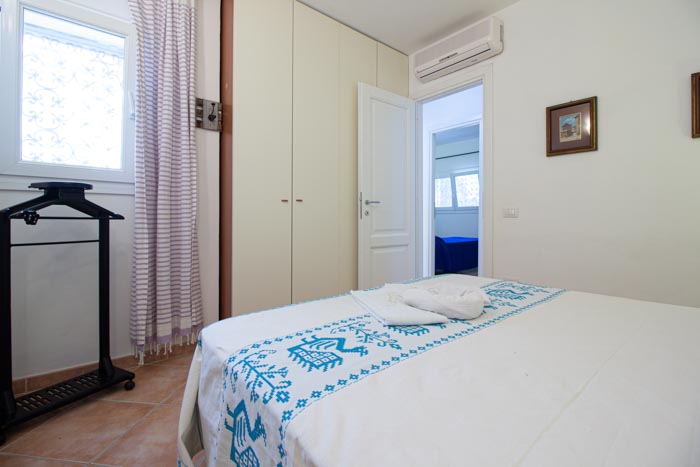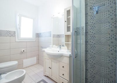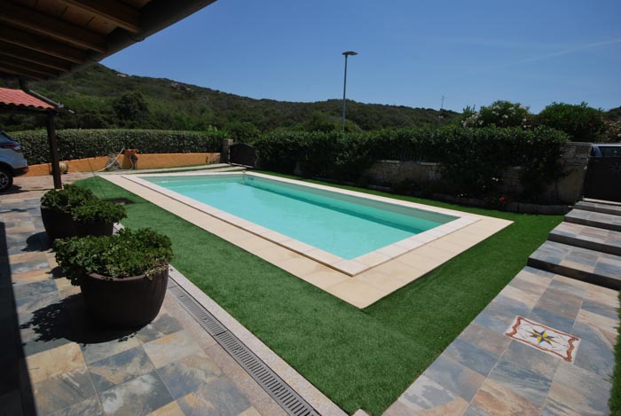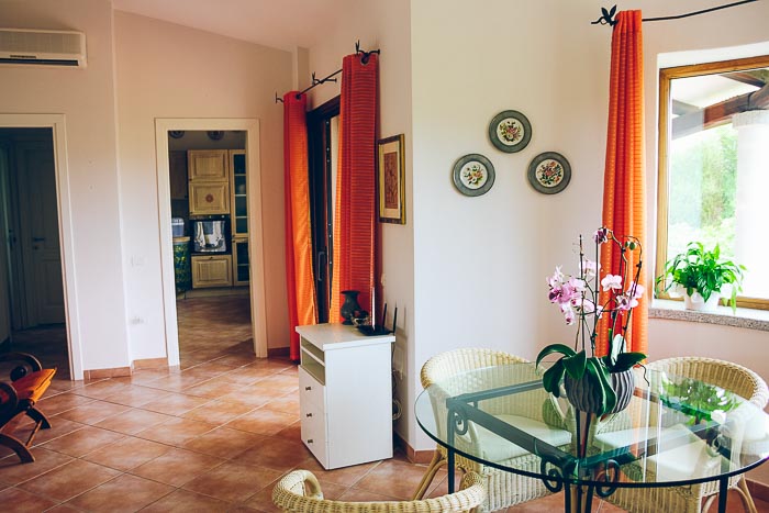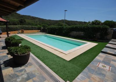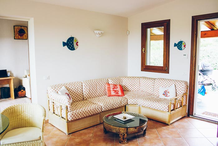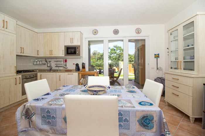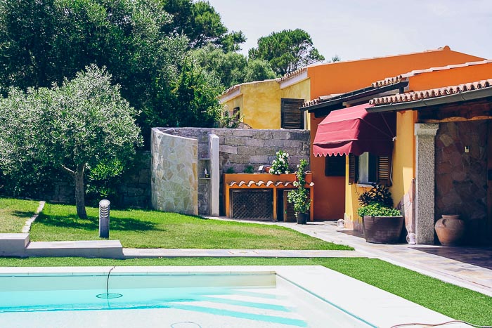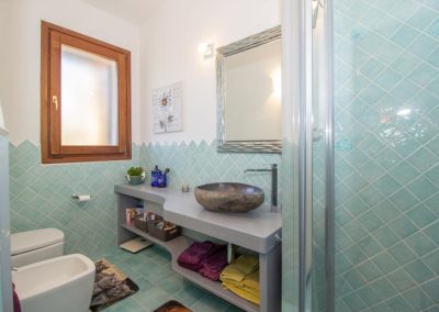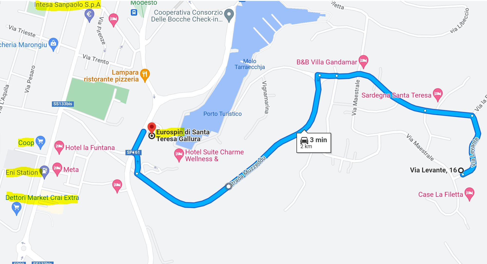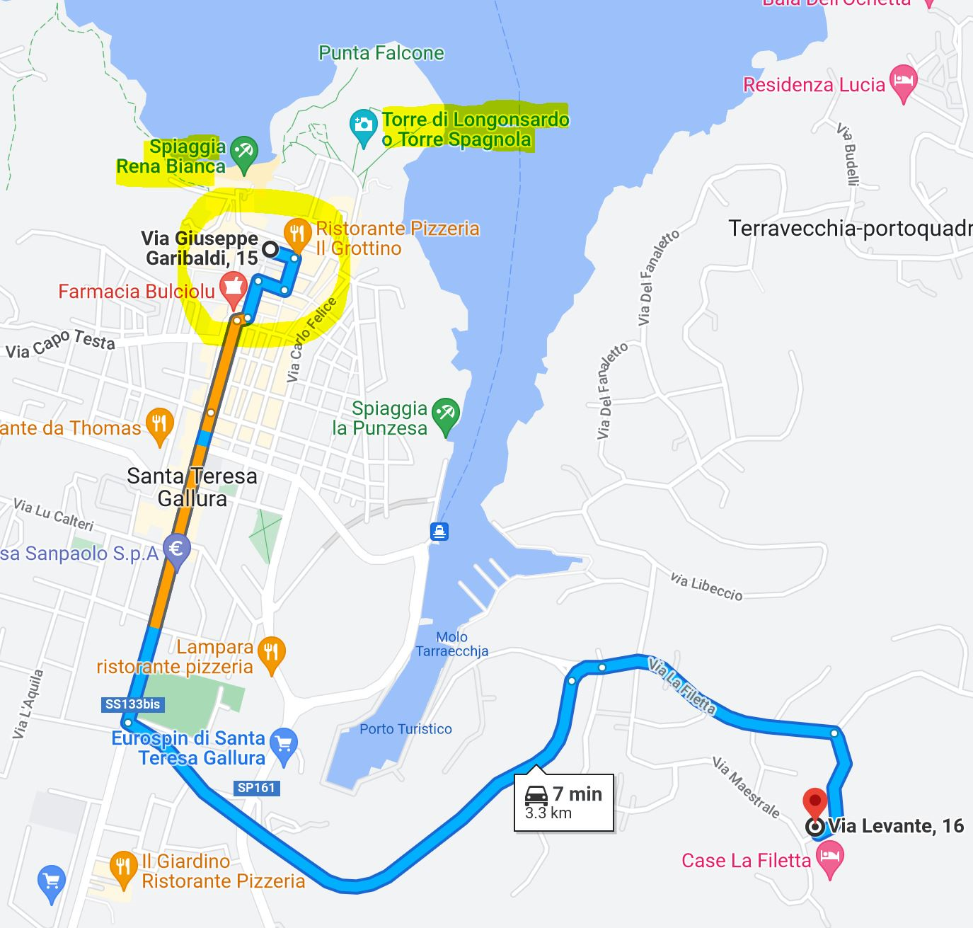 The villa is ideally located just off the town center, in a residential neighborhood (“La Filetta”) that preserves its quiet mood even during the busy summer months, while still being very close to all essential services. Everything that you need is within walking and biking distance, as the neighbor is connected to the town center by a convenient sidewalk). Grocery stores, gas stations and banks are 3 minutes away by car (2 km). The town center, with its beautiful Rena Bianca (“White Sand”) beach and the historical Longonsardo tower are 7 minutes away by car (3.3 km). If you are up for a longer walk, you can also reach the town center via the harbor, which is a 17 minutes walk (1.2 km) from the villa.